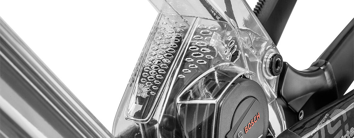 Il motore è ancora una volta Bosch: dotato di 85 Nm di coppia offre fino al 340% di assistenza; inoltre ha un software totalmente nuovo che amplifica questa sensazione naturale. Il motore è uno degli elementi chiave di qualsiasi e-MTB, quindi abbiamo voluto proteggerlo dagli impatti. Sulla Patron eRIDE il motore è posizionato verticalmente e sostenuto da sotto. Il telaio agisce come un nido con il motore al suo interno per offrire un supporto naturale. Una cosa su cui i tecnici svizzeri hanno lavorato molto è la posizione molto alta dell’ammortizzatore: in questo modo è stato possibile posizionare il motore in modo verticale fissandolo al telaio nella parte inferiore. Questo permette una migliore protezione agli impatti, una maggiore distanza da terra e un design più pulito e geometrico. La forma a “V” del telaio crea un alloggio naturale del motore.